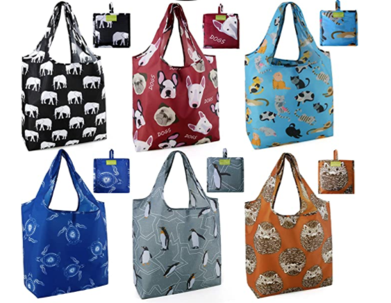 The BeeGreen reusable grocery bags are extra large and can hold up to 50+ pounds of groceries. These bags replace 2-3 plastic grocery bags. These reusable grocery bags are foldable and can easily be folded into the attached pocket-size pouch. The BeeGreen bags come in a pack of six with a variety of patterns!