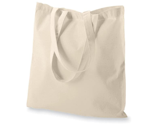 Here is a tote bag that is ideal for groceries. For $21.99, you can get a 12-pack of these plain, 100% cotton reusable bags. They are unbleached and eco-friendly, measuring 15 inches x 16 inches with a 27-inch handle. Since they are a plain bag, you could easily decorate these bags as well.