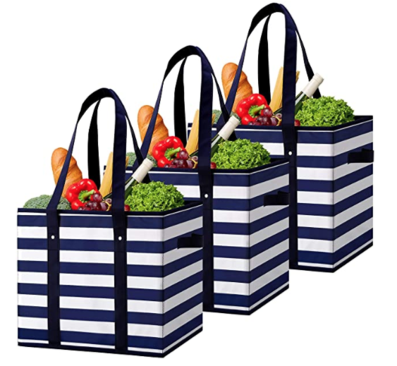 Are you searching for a unique tote bag that can double as a sturdy box, too? These box totes come in a three-pack for $18.99. The totes fold up for easy storage, and the cardboard insert makes them sturdy when unfolded. The outside is made from a durable material that is easy to clean. There are two handles as well, making this bag easy to carry, whether you choose the long or short handles.