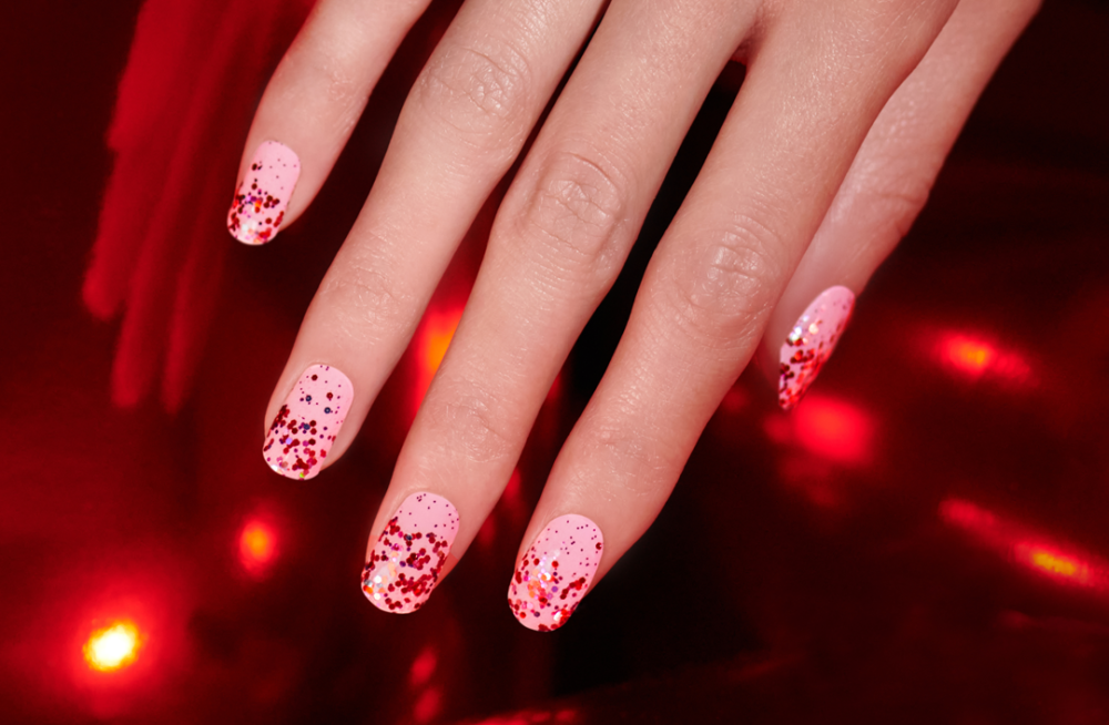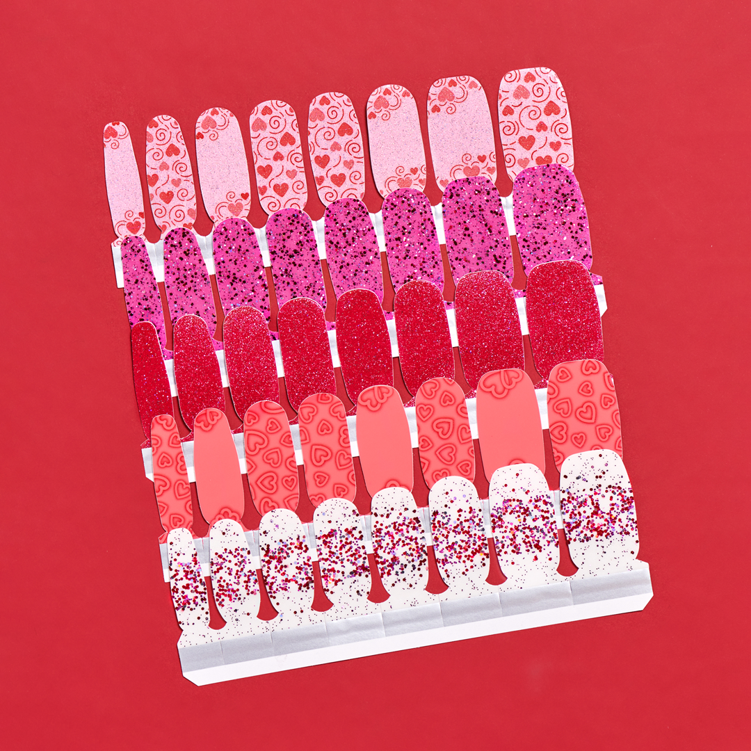 Love Shack: Keep the love alive with Love Shack, a clear glitter-dipped shade of shimmery red, pink, and silver glitter. Wear these strips alone on bare nails or layer over your favorite nail color for a whole new look. Glitter finish.