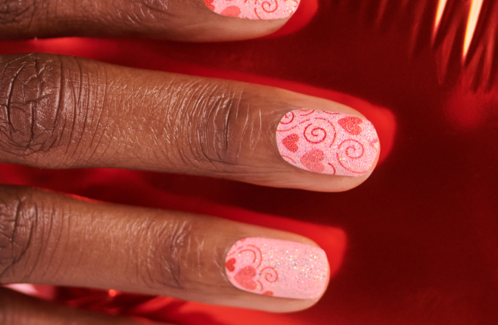 Queen of Hearts: Love is in the air with Queen of Hearts, a soft, light bubblegum pink shade with red and pink hearts, red swirls, and silver micro glitter. Glitter finish.
